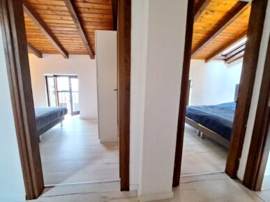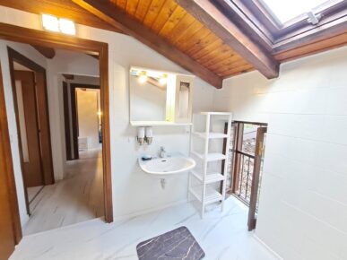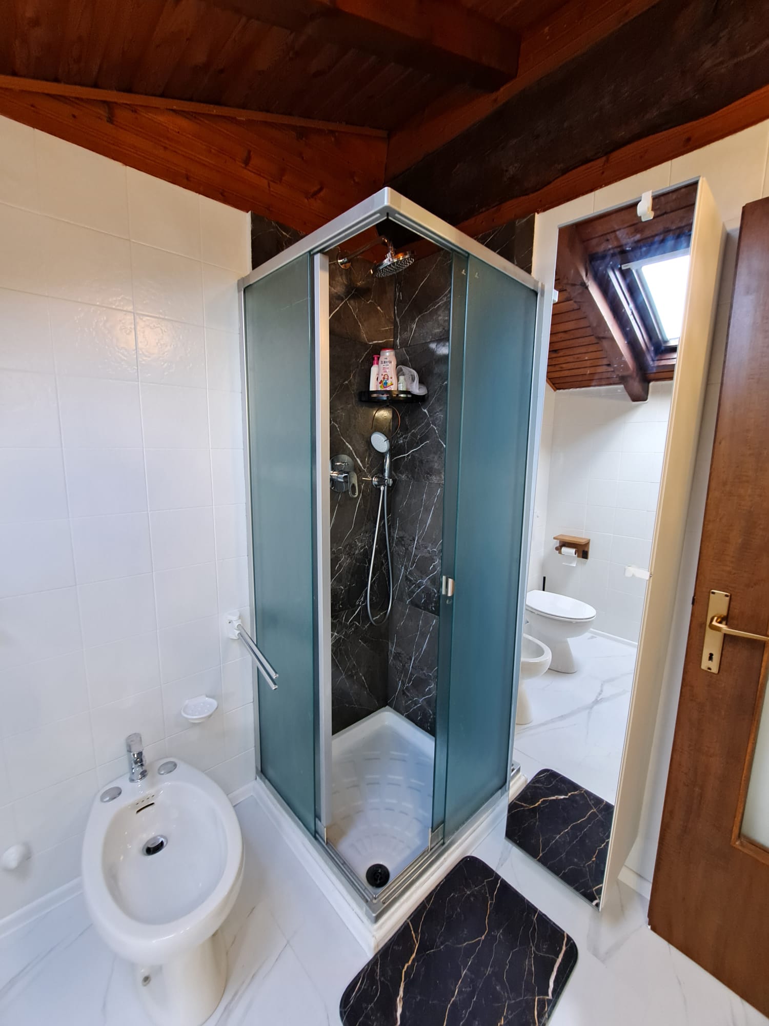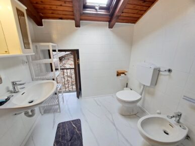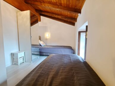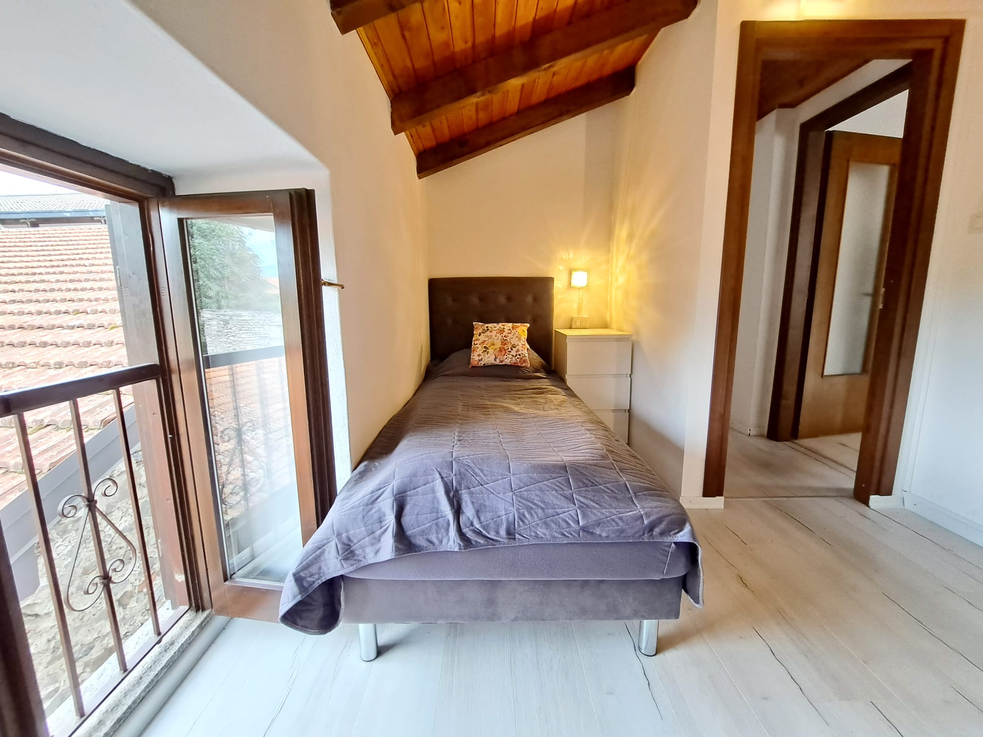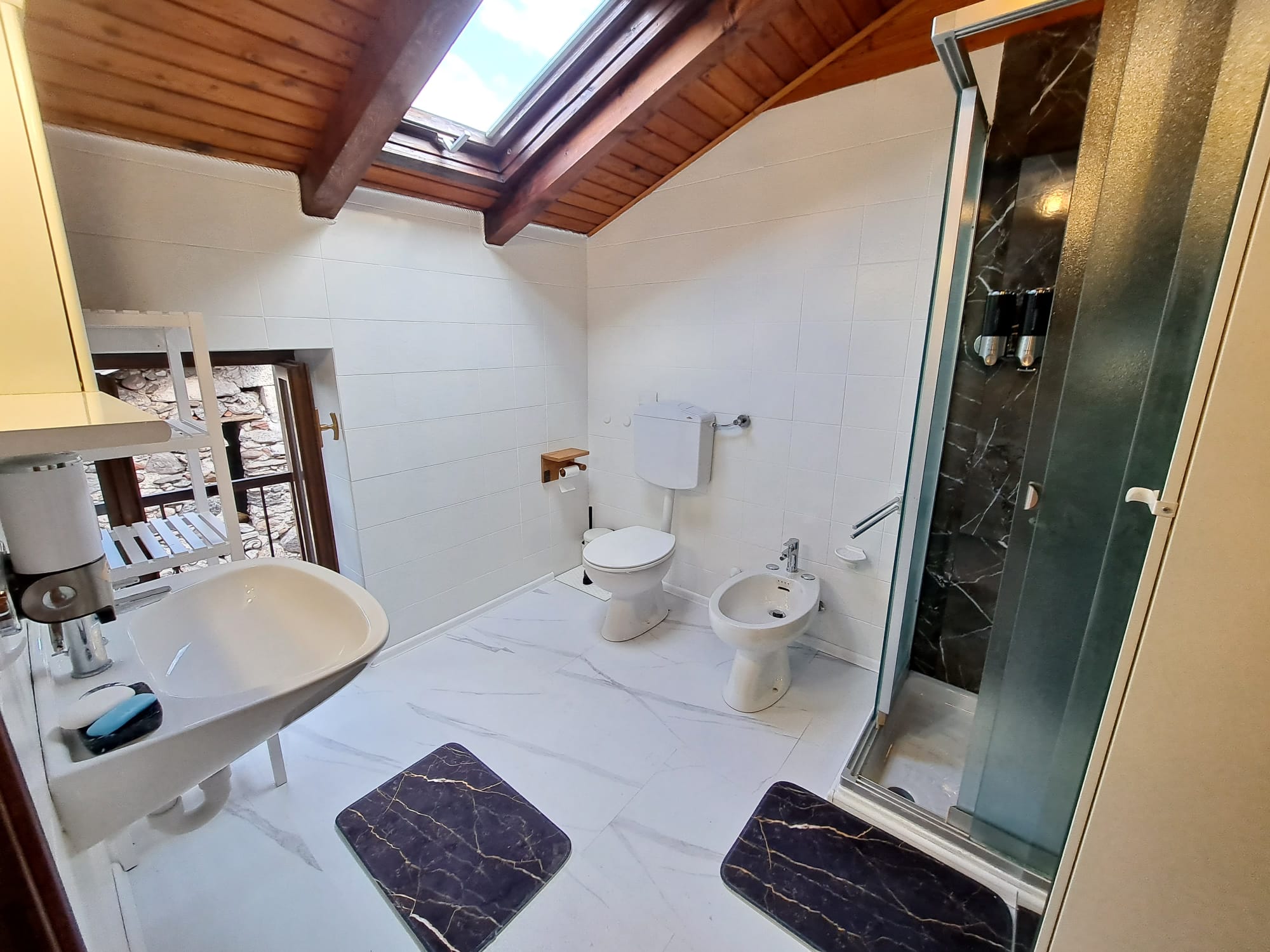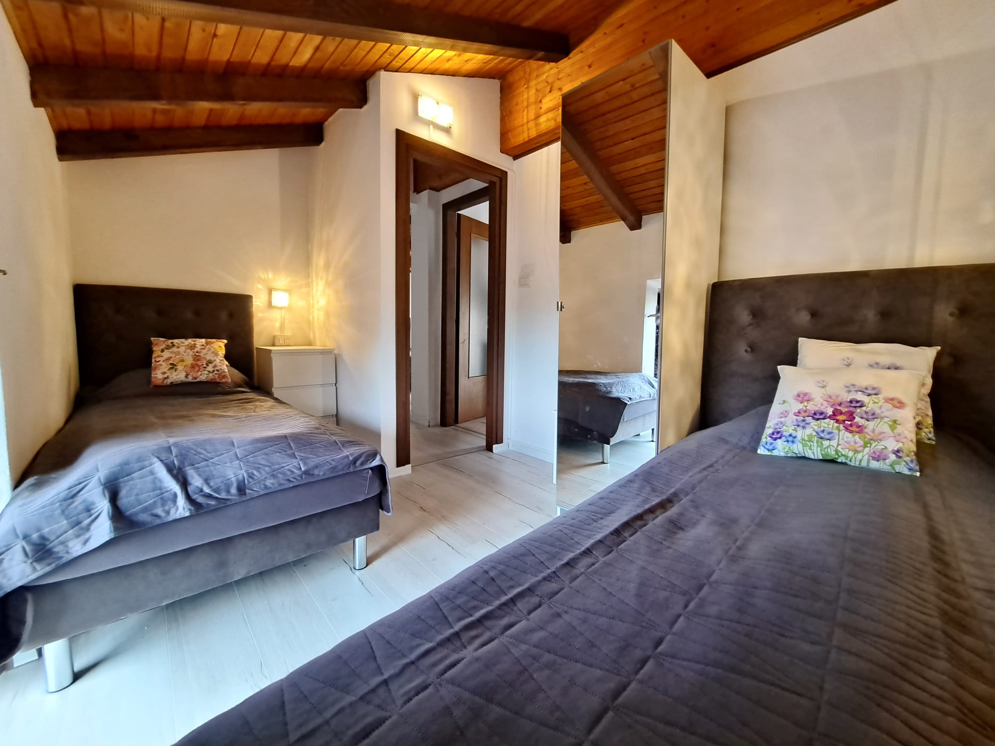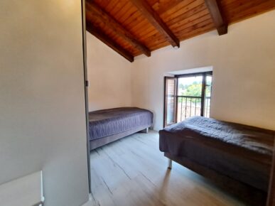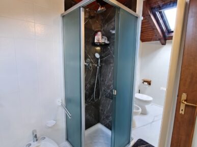 Upstairs, in the privacy of the house, there are 3 bedrooms. 2 with single beds, connectable, and 1 bedroom with a double bed. Here there is also a bathroom with a shower, bidet, and toilet.